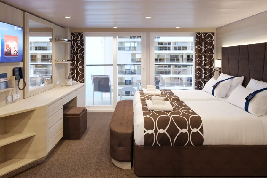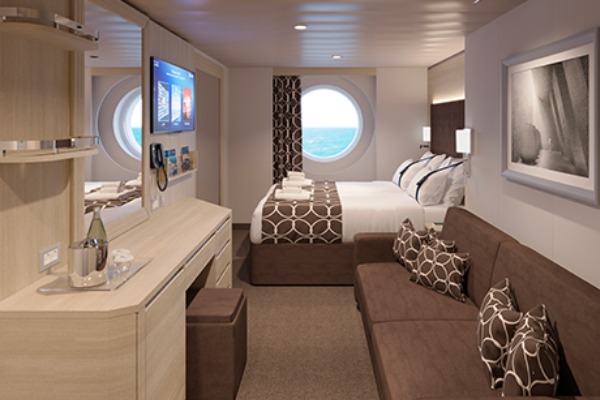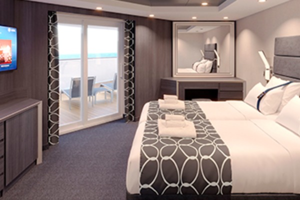 В каюте: две односпальные кровати (при необходимости трансформируются в двуспальную кровать), ванная комната (раковина, душевая кабина, туалет), телефон, фен, мини-бар (включен в стоимость), сейф, кондиционер, кофемашина, интерактивное TV, беспроводной интернет (безлимитный интернет-пакет Browse cruise package на 2 устройства), персональный балкон с мебелью для отдыха.
