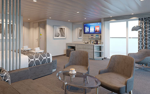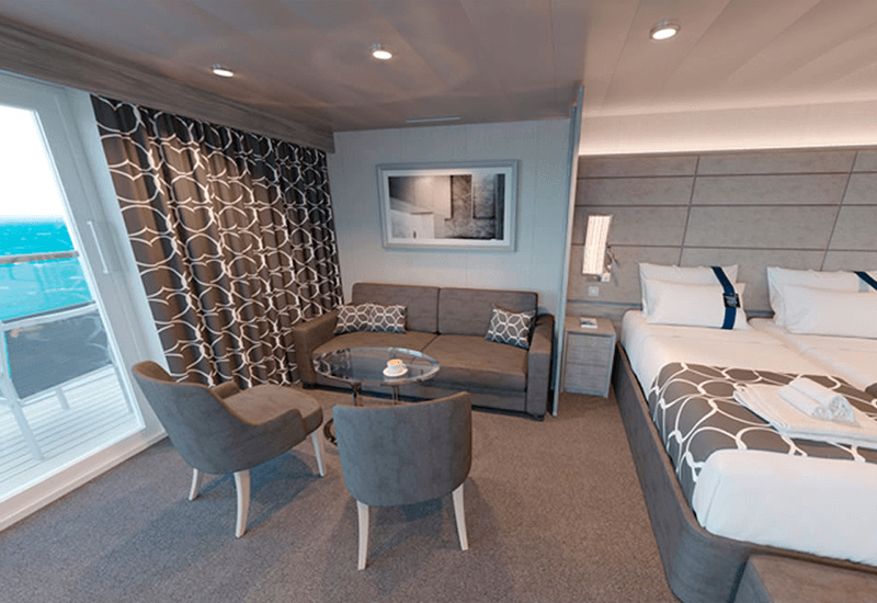 В каюте: две односпальные кровати (при необходимости трансформируются в двуспальную кровать – 2-ой уровень), гостиная с раскладным диваном, ванная комната (раковина, душевая кабина, туалет), ванная комната (раковина, ванна, туалет), большая гардеробная, телефон, фен, мини-бар (включен в стоимость), сейф, кондиционер, кофемашина, интерактивное TV, беспроводной интернет (безлимитный интернет-пакет Browse cruise package на 2 устройства), персональный балкон с мебелью для отдыха.