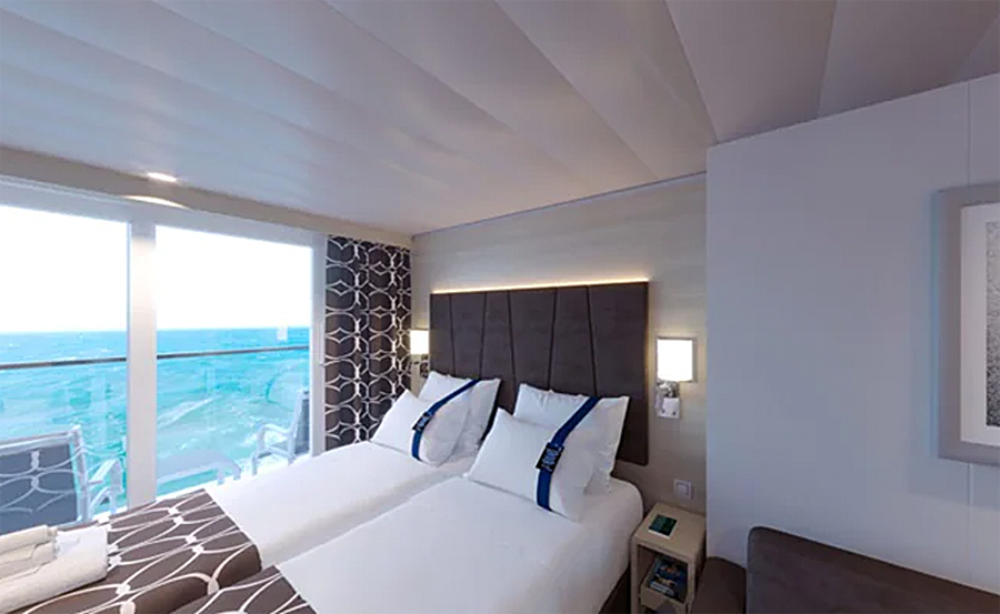 В каюте: две односпальные кровати (при необходимости трансформируются в двуспальную кровать), ванная комната (раковина, душевая кабина, туалет), телефон, фен, мини-бар (включен в стоимость), сейф, кондиционер, кофемашина, интерактивное TV, беспроводной интернет (безлимитный интернет-пакет Browse cruise package на 2 устройства), персональный балкон с мебелью для отдыха.