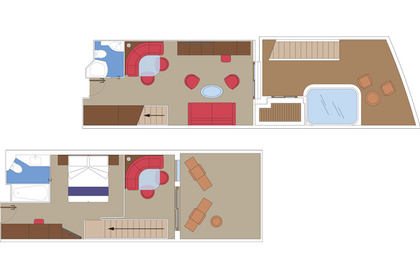 В каюте: две односпальные кровати (при необходимости трансформируются в двуспальную кровать – 2-ой уровень), гостиная с раскладным диваном, ванная комната (раковина, душевая кабина, туалет), ванная комната (раковина, ванна, туалет), большая гардеробная, телефон, фен, мини-бар (включен в стоимость), сейф, кондиционер, кофемашина, интерактивное TV, беспроводной интернет (безлимитный интернет-пакет Browse cruise package на 2 устройства), персональный балкон с мебелью для отдыха и джакузи.