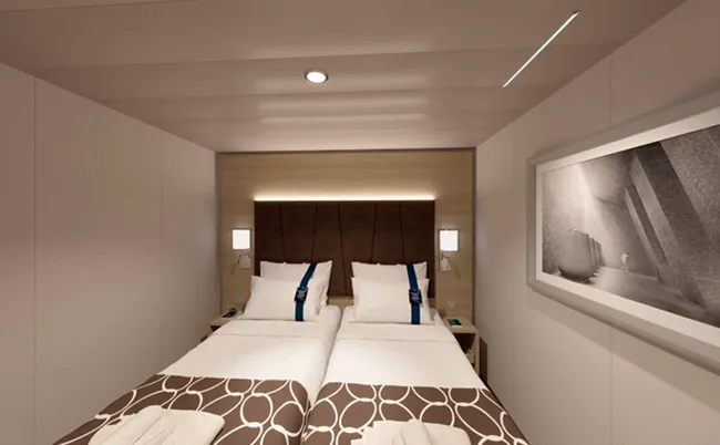 В каюте: две односпальные кровати (при необходимости трансформируются в двуспальную кровать), ванная комната (раковина, душ, туалет), телефон, фен, мини-бар (включен в стоимость), сейф, кондиционер, кофемашина, интерактивное TV, беспроводной интернет (безлимитный интернет-пакет Browse cruise package на 2 устройства), каюта без окна.