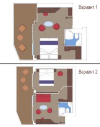 В каюте: две односпальные кровати (при необходимости трансформируются в двуспальную кровать – 2-ой уровень), гостиная с раскладным диваном, ванная комната (раковина, душевая кабина, туалет), ванная комната (раковина, ванна, туалет), большая гардеробная, телефон, фен, мини-бар (включен в стоимость), сейф, кондиционер, кофемашина, интерактивное TV, беспроводной интернет (безлимитный интернет-пакет Browse cruise package на 2 устройства), персональный балкон с мебелью для отдыха.
