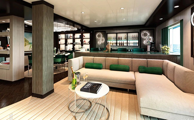 В каюте: большая двуспальная кровать, гостиная с раскладным диваном, ванная комната (раковина, душевая кабина, туалет), отдельная зона столовая, большая гардеробная, телефон, фен, мини-бар (включен в стоимость), сейф, кондиционер, кофемашина, интерактивное TV, беспроводной интернет (безлимитный интернет-пакет Browse cruise package на 2 устройства), панорамное окно во всю стену, персональный балкон с мебелью для отдыха и джакузи.