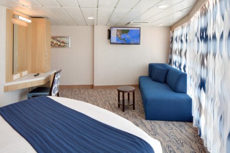 В каюте: двуспальная кровать, две односпальные кровати, две ванные комнаты (раковина, душ, туалет), диван, интерактивное TV, сейф, фен, мини-бар (за дополнительную плату), халаты, тапочки, набор туалетных принадлежностей, комплект полотенец, доставка багажа, стеклянная балконная дверь-окно, персональный балкон с мебелью для отдыха.