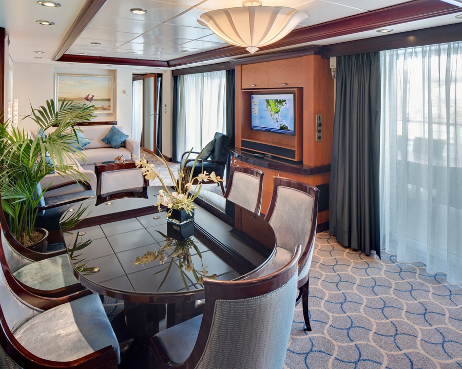 В каюте: две двуспальные кровати (при необходимости трансформируется в две односпальные кровати), двуспальный диван, две односпальные кровати (при необходимости конвертируются в одну двуспальную) и два места верхнего расположения, две односпальные кровати и два дополнительных спальных места верхнего расположения, две ванные комнаты (раковина, ванна, туалет), две ванные комнаты (раковина, душ, ванна, туалет), банные халаты, тапочки, комплект полотенец, туалетные принадлежности, фен, кресло, кофейный столик, интерактивное TV, телефон, сейф, кондиционер, мини-бар (оплачивается дополнительно), выделенная линия для подключения к сети интернет (оплачивается дополнительно), стеклянная балконная дверь-окно, персональный балкон с мебелью для отдыха и джакузи.