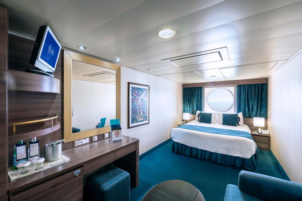В каюте: две односпальные кровати (при необходимости трансформируются в двуспальную кровать), ванная комната (раковина, душ, туалет), телефон, фен, мини-бар, сейф, кондиционер, интерактивное TV, беспроводной Интернет (оплачивается дополнительно), обзорное окно (не открывается).