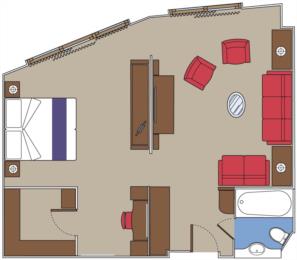 В каюте: две односпальные кровати (при необходимости трансформируются в двуспальную кровать), зона гостиной с диваном, ванная комната (раковина, ванна, туалет), гардеробная, телефон, фен, мини-бар (включен в стоимость), сейф, кондиционер, интерактивное TV, беспроводной интернет (безлимитный интернет-пакет Browse cruise package на 2 устройства), персональный балкон с мебелью для отдыха.