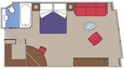 В каюте: две односпальные кровати (при необходимости трансформируются в двуспальную кровать), зона гостиной с диваном, ванная комната (раковина, ванна, туалет), гардеробная, телефон, фен, мини-бар (включен в стоимость), сейф, кондиционер, интерактивное TV, беспроводной интернет (безлимитный интернет-пакет Browse cruise package на 2 устройства), персональный балкон с мебелью для отдыха.