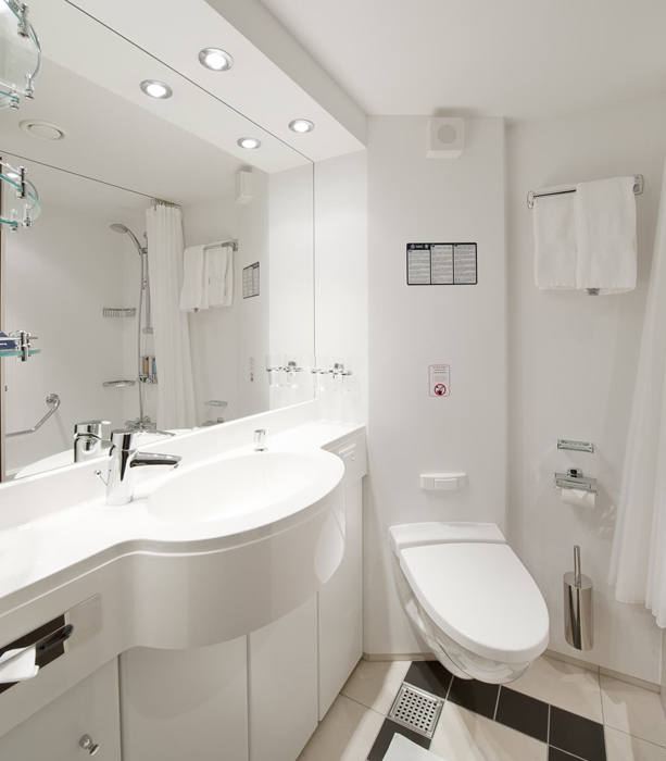В каюте: две односпальные кровати (при необходимости трансформируются в двуспальную кровать), ванная комната (раковина, душ, туалет), телефон, фен, мини-бар, сейф, кондиционер, интерактивное TV, беспроводной Интернет (оплачивается дополнительно), каюта без окна.
