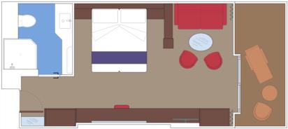 В каюте: большая двуспальная кровать, зона гостиной с диваном, гардеробная, ванная комната с ванной и душем, телефон, фен, мини-бар (включен в стоимость), сейф, кондиционер, кофемашина, интерактивное TV, беспроводной интернет (безлимитный интернет-пакет Browse cruise package на 2 устройства), балкон с обеденным столом и персональным джакузи.