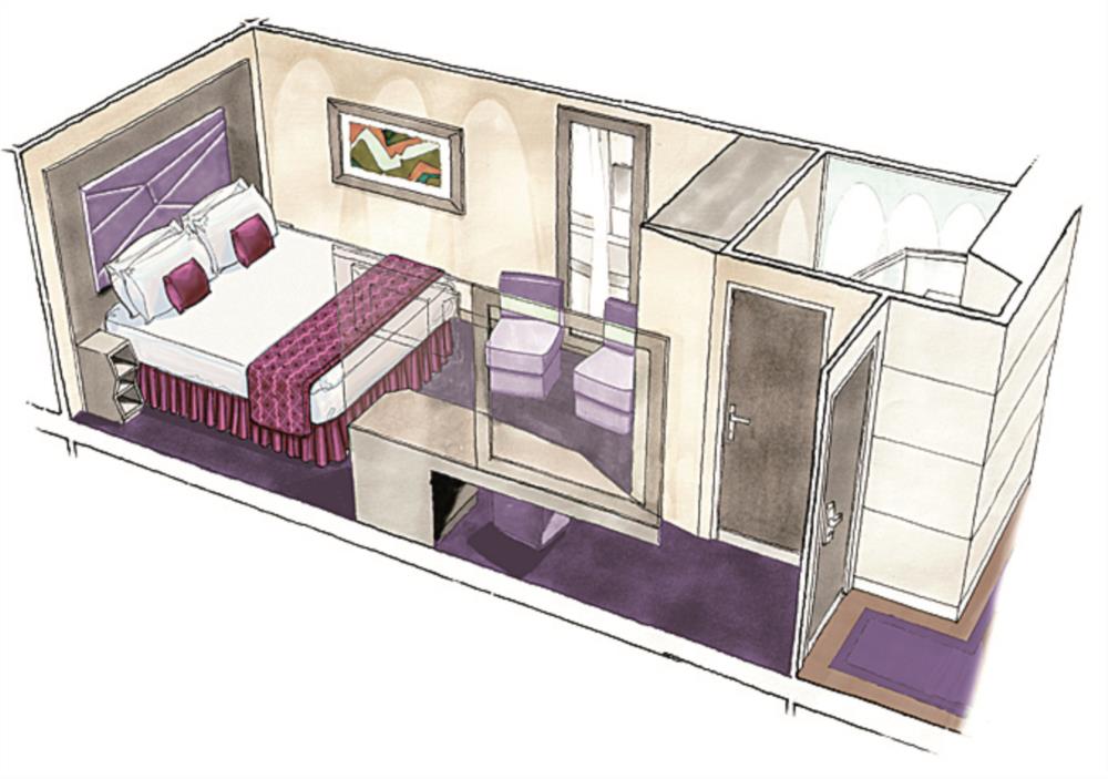 В каюте: две кровати (поставленные вместе или раздельно по вашему желанию), ванная комната с душем, телефон, фен, мини-бар, сейф, кондиционер, интерактивное TV, беспроводной Интернет (оплачивается дополнительно), окно (не открывается).