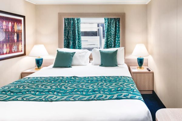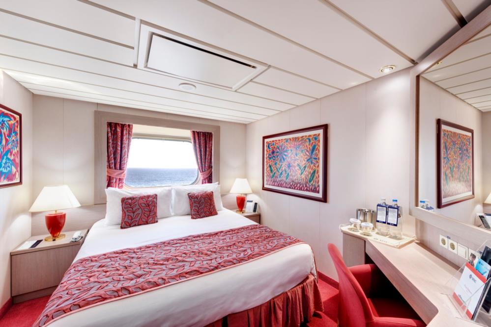В каюте: две односпальные кровати (при необходимости трансформируются в двуспальную кровать), ванная комната (раковина, душ, туалет), телефон, фен, мини-бар, сейф, кондиционер, интерактивное TV, беспроводной интернет (оплачивается дополнительно), окно с ограниченным видом (не открывается).
