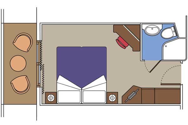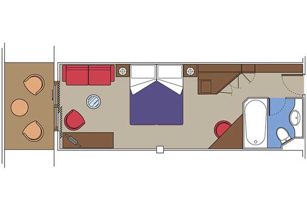 В каюте: две односпальные кровати (при необходимости трансформируются в двуспальную кровать), раскладной диван, ванная комната (раковина, ванна, туалет), гардеробная, сейф, фен, кондиционер, телефон, мини-бар, интерактивное TV, беспроводной интернет (оплачивается дополнительно), персональный балкон с мебелью для отдыха.