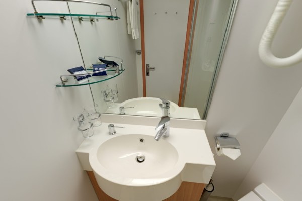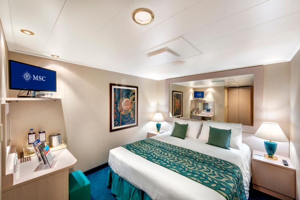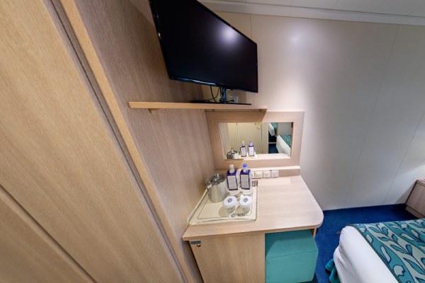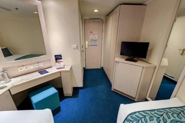 В каюте: две односпальные кровати (при необходимости трансформируются в двуспальную кровать), ванная комната (раковина, душ, туалет), телефон, фен, мини-бар, сейф, кондиционер, интерактивное TV, беспроводной интернет (оплачивается дополнительно), каюта без окна.
