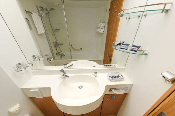 В каюте: две односпальные кровати (при необходимости трансформируются в двуспальную кровать), ванная комната (раковина, душ, туалет), телефон, фен, мини-бар, сейф, кондиционер, интерактивное TV, беспроводной интернет (оплачивается дополнительно), обзорное окно (не открывается).