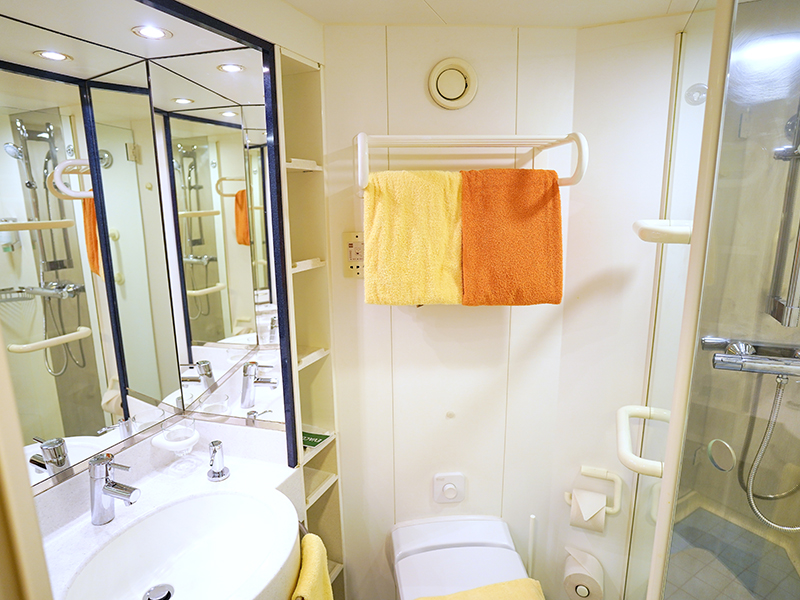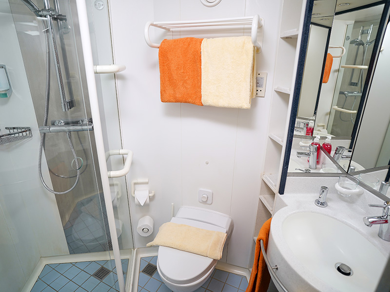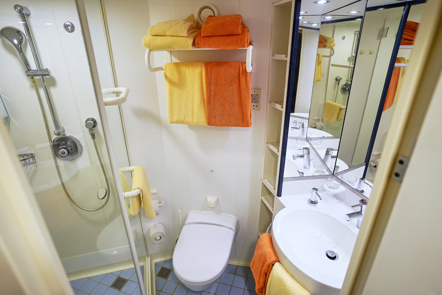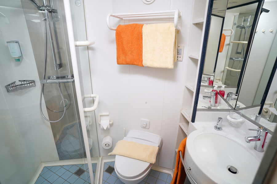 В каюте: две односпальные кровати, ванная комната (раковина, душ, туалет), кондиционер, гардероб, телевизор, телефон, фен, сейф, халаты, увлажнитель воздуха, окно с ограниченным видом (шлюпкой или конструкцией лайнера).