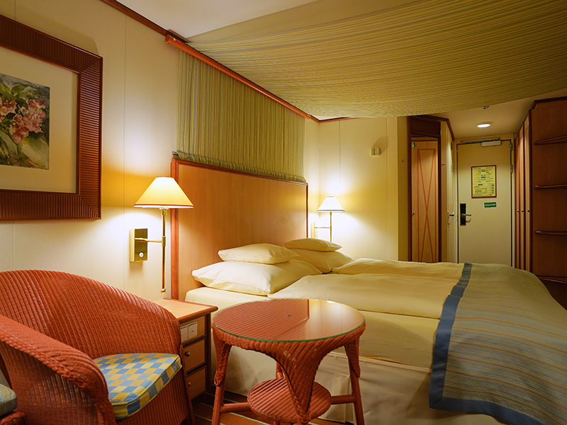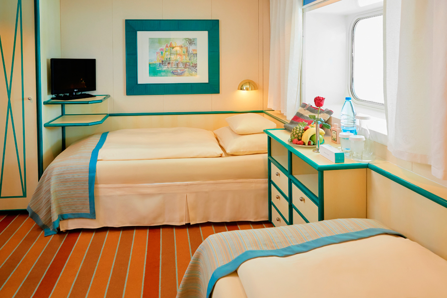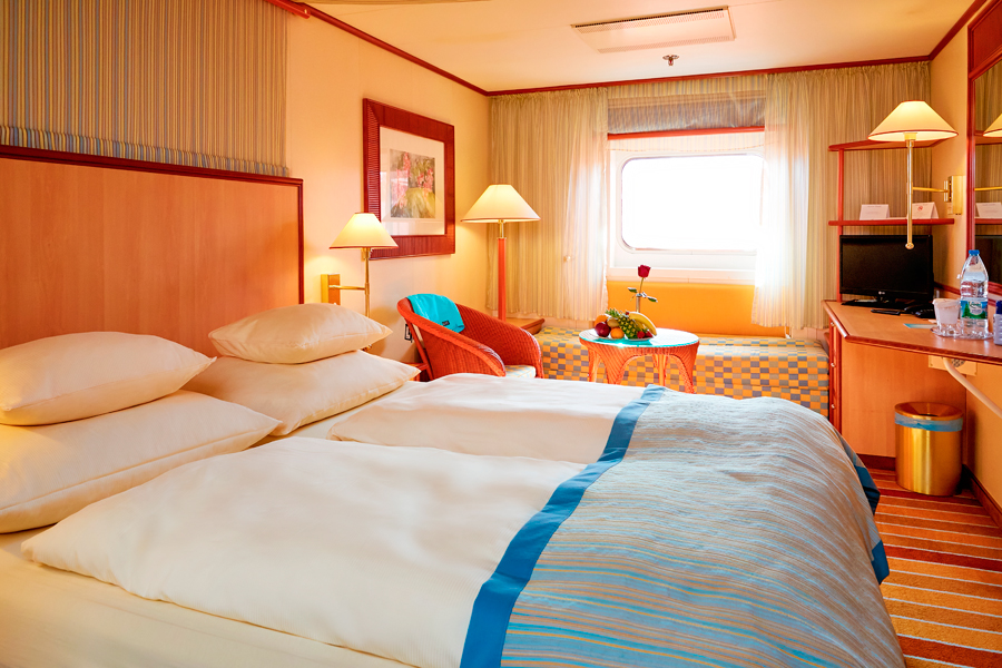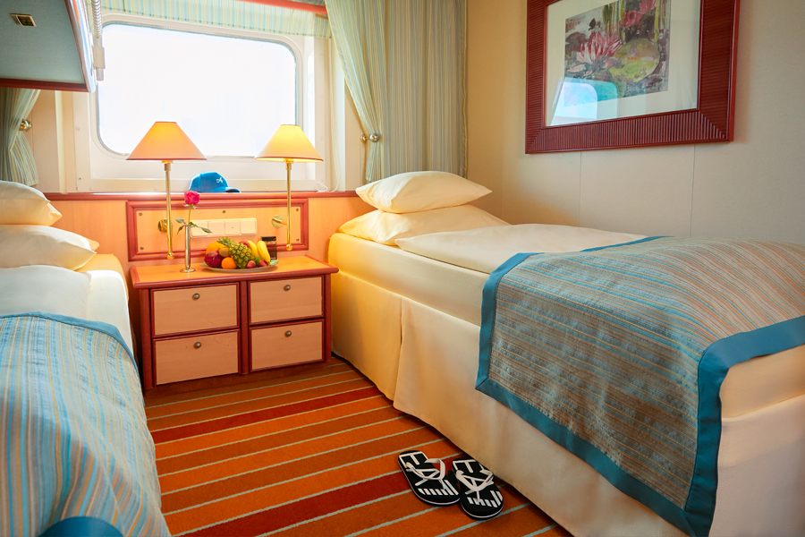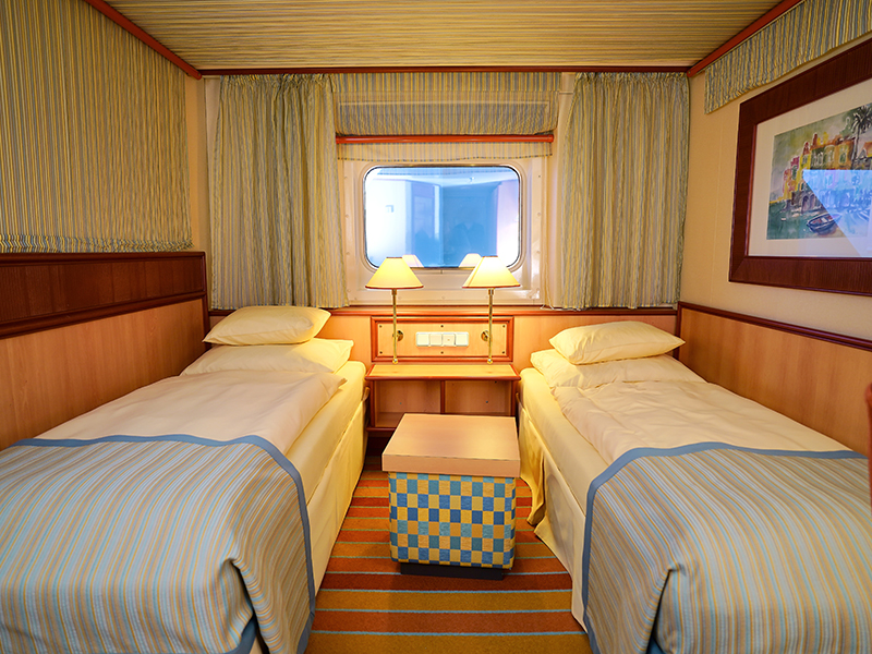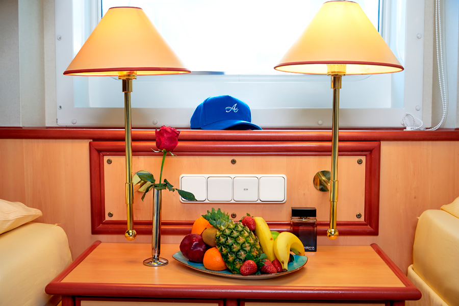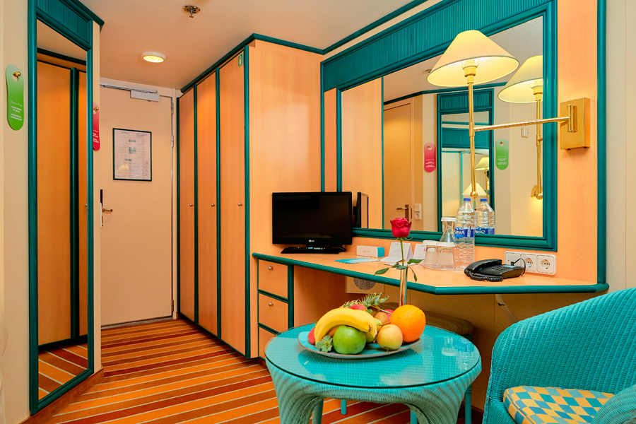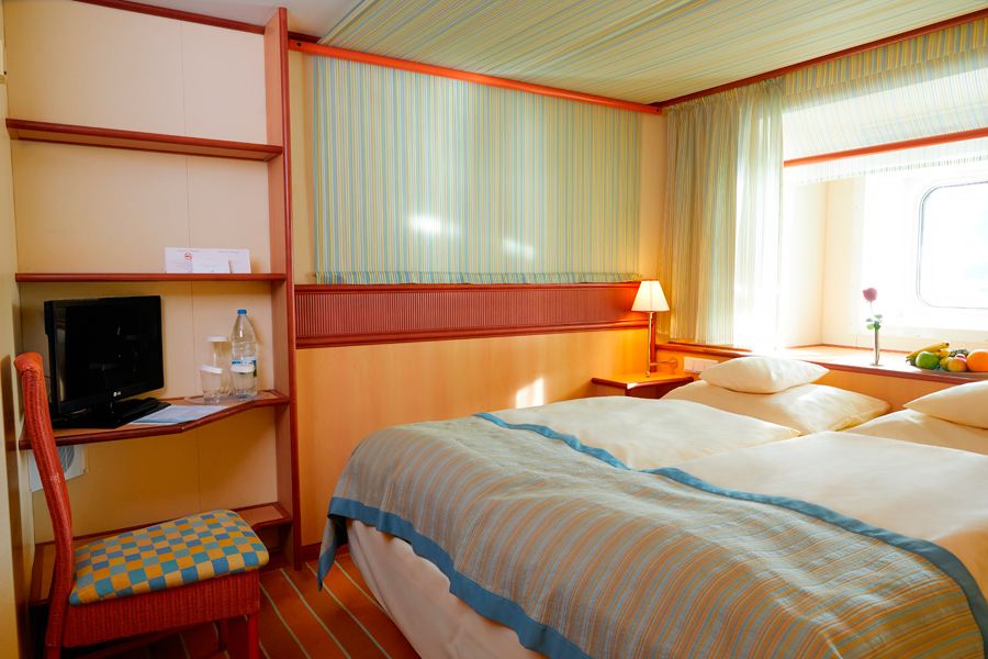 В каюте: две односпальные кровати, ванная комната (раковина, душ, туалет), кондиционер, гардероб, телевизор, телефон, фен, сейф, халаты, увлажнитель воздуха, иллюминатор.