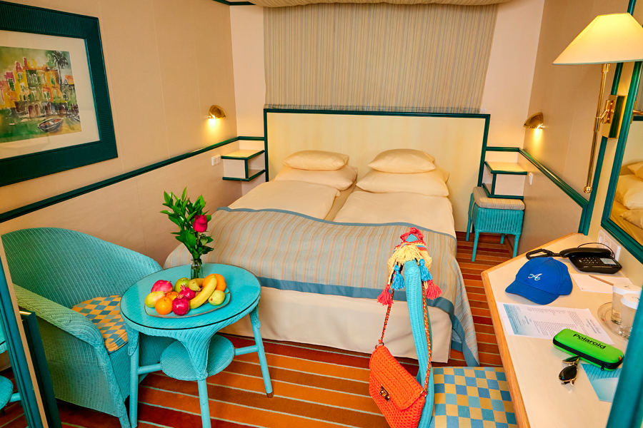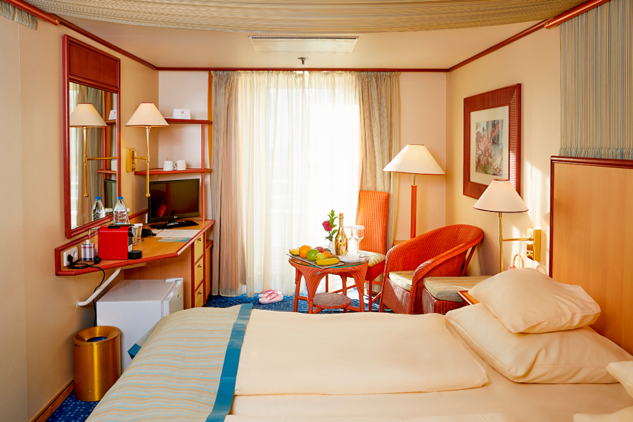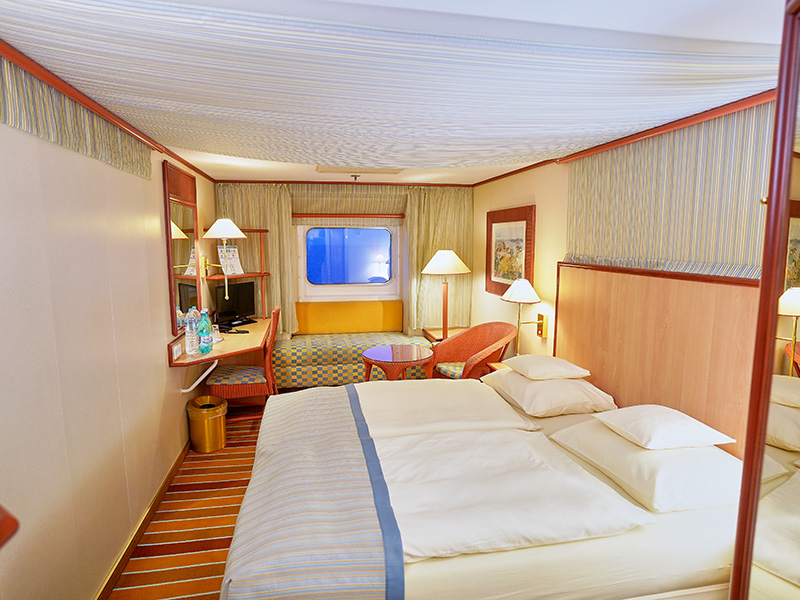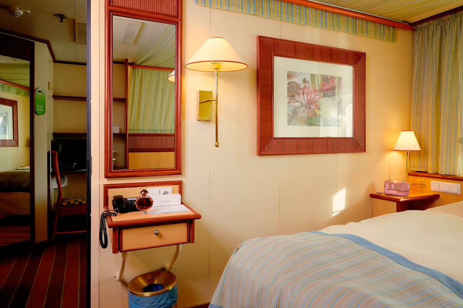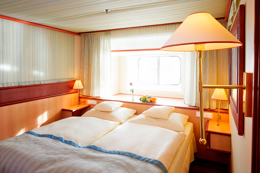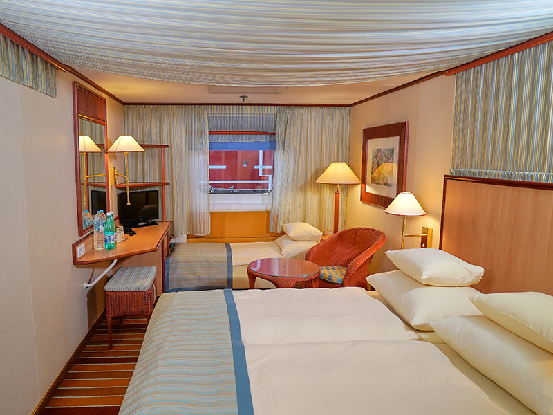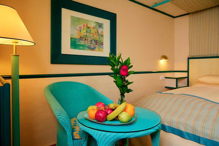 В каюте: две односпальные кровати, ванная комната (раковина, душ, туалет), кондиционер, гардероб, телевизор, телефон, фен, сейф, халаты, увлажнитель воздуха, иллюминатор.