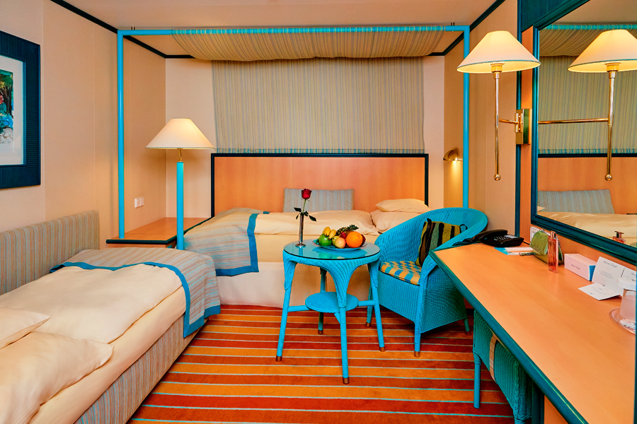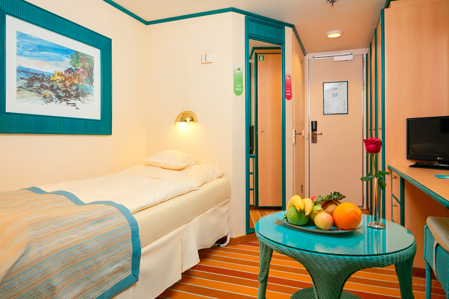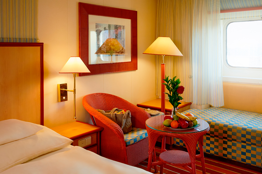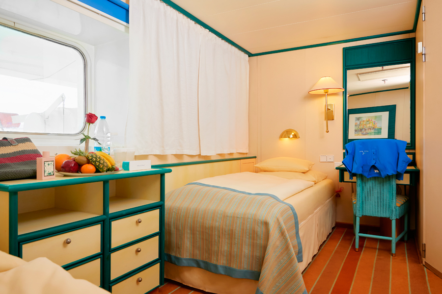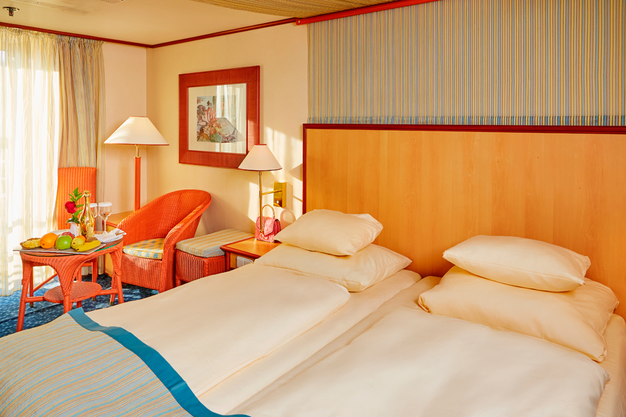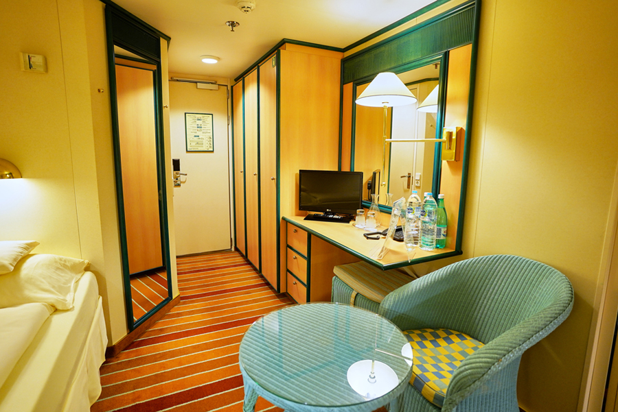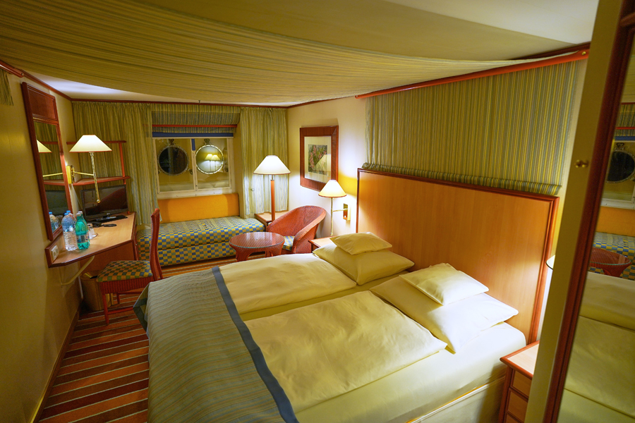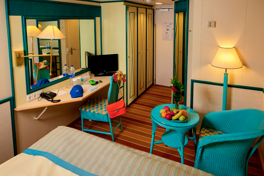 В каюте: две односпальные кровати, ванная комната (раковина, душ, туалет), кондиционер, гардероб, телевизор, телефон, фен, сейф, халаты, увлажнитель воздуха, иллюминатор.