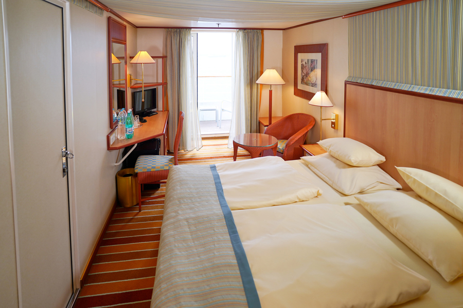 В каюте: двуспальная кровать, ванная комната (раковина, душ, туалет), холодильник, кондиционер, гардероб, телевизор, телефон, фен, сейф, халаты, увлажнитель воздуха, балкон.