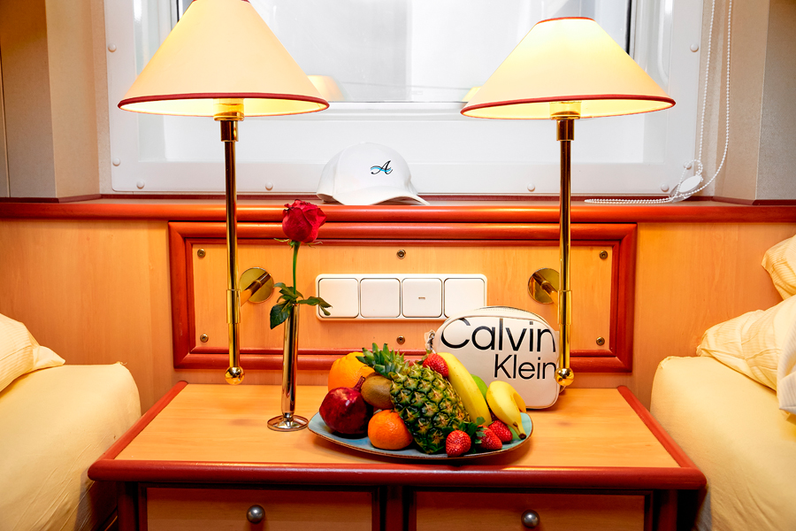 В каюте: двуспальная кровать, диван (раскладывается в полноценное спальное место), ванная комната (раковина, ванна, туалет), холодильник, кондиционер, гардероб, телевизор, телефон, фен, сейф, халаты, увлажнитель воздуха, кофемашина, чайник, приветственный набор (фруктовая тарелка и бутылка вина), капитанский вид с частной палубы.