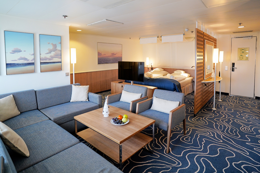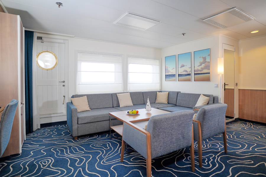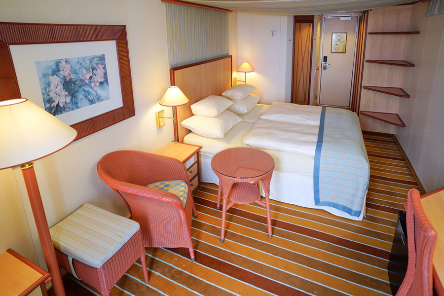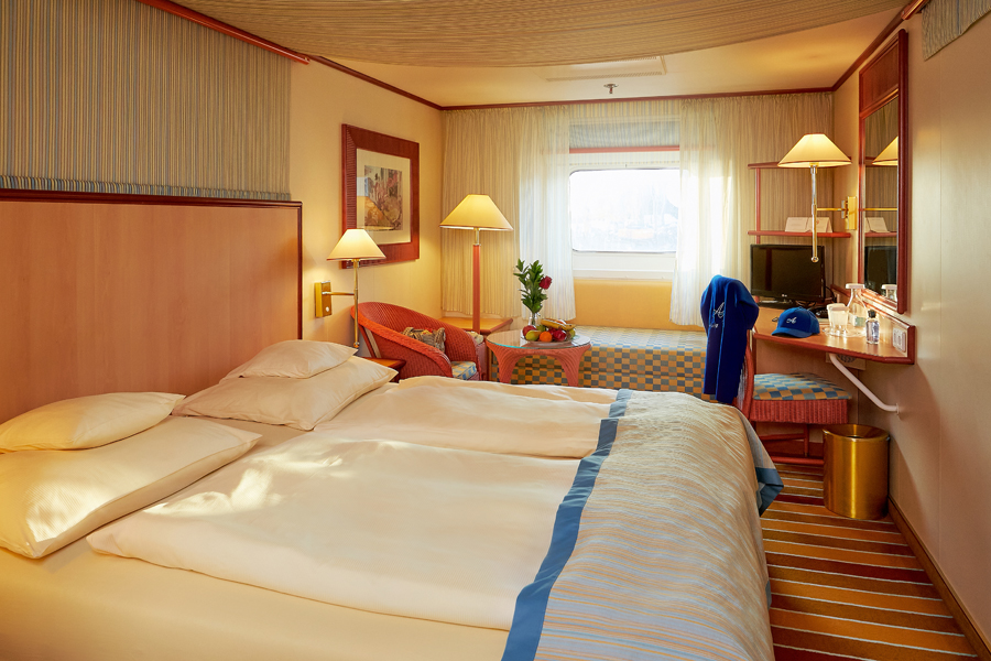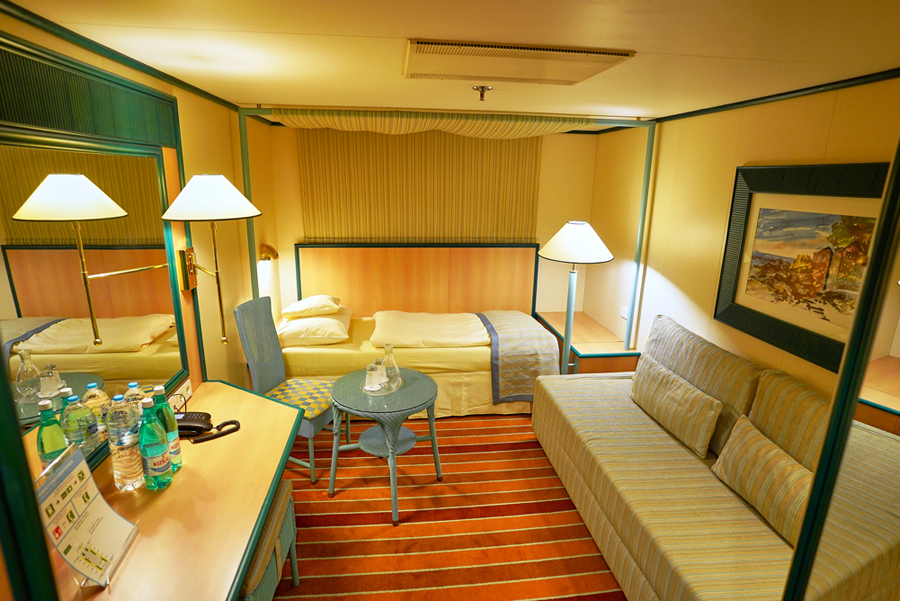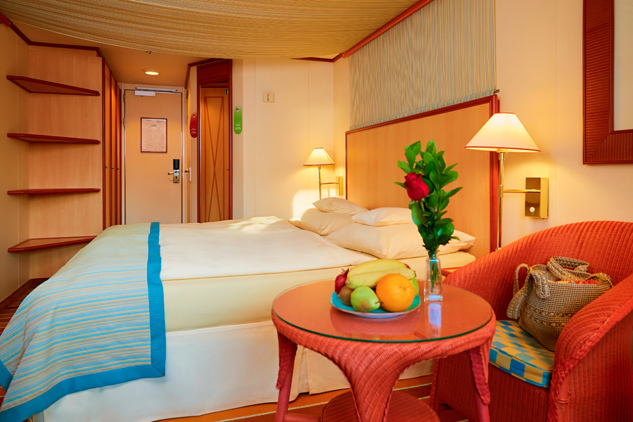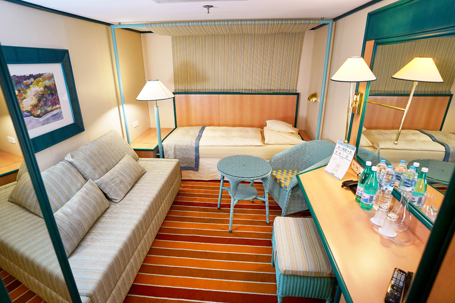 В каюте: двуспальная кровать, диван, ванная комната (раковина, душ, туалет), кондиционер, гардероб, телевизор, телефон, фен, сейф, халаты, увлажнитель воздуха, окно с ограниченным видом (шлюпкой или конструкцией лайнера).