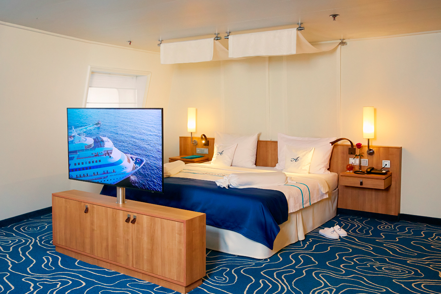 В каюте: двуспальная кровать, ванная комната (раковина, душ, туалет), кондиционер, гардероб, телевизор, телефон, фен, сейф, халаты, увлажнитель воздуха, панорамное окно.