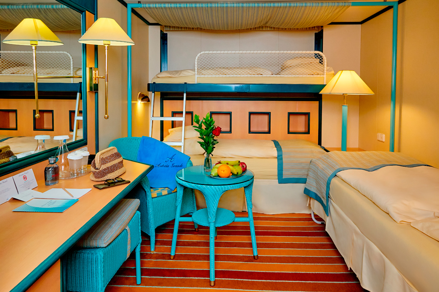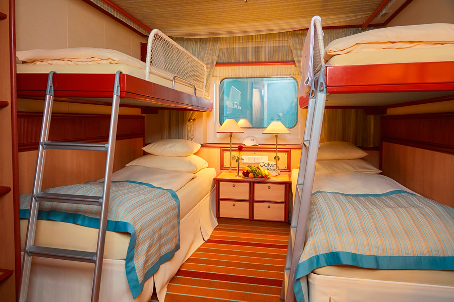 Площадь каюты от 14 до 17 м². Максимальная вместимость: 4 человека.