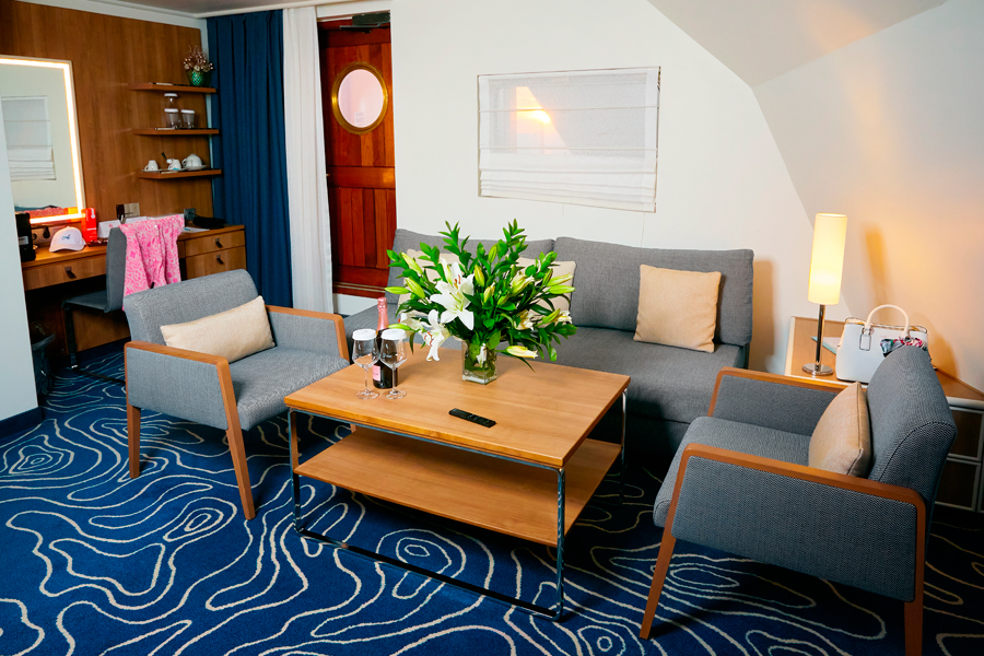 В каюте: двуспальная кровать, диван, ванная комната (раковина, ванна, туалет), холодильник, кондиционер, гардероб, телевизор, телефон, фен, сейф, халаты, увлажнитель воздуха, кофемашина, чайник, приветственный набор (фруктовая тарелка и бутылка вина), балкон.