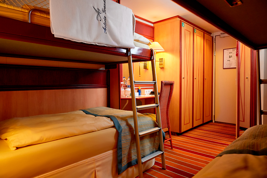 В каюте: две односпальные кровати, две верхние откидные полки-пульманы, ванная комната (раковина, душ, туалет), кондиционер, гардероб, телевизор, телефон, фен, сейф, халаты, увлажнитель воздуха, окно с панорамным видом.