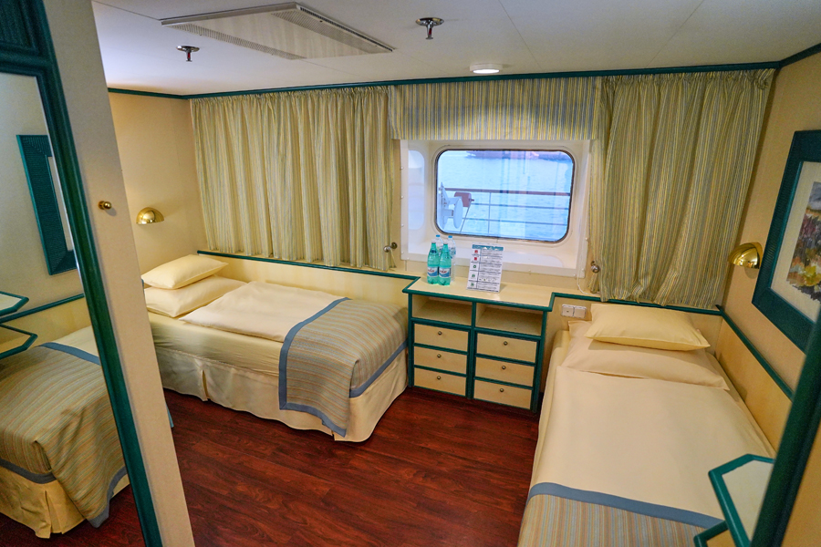 В каюте: две односпальные кровати, две верхние откидные полки-пульманы, ванная комната (раковина, душ, туалет), кондиционер, гардероб, телевизор, телефон, фен, сейф, халаты, увлажнитель воздуха, окно с ограниченным видом (шлюпкой или конструкцией лайнера).