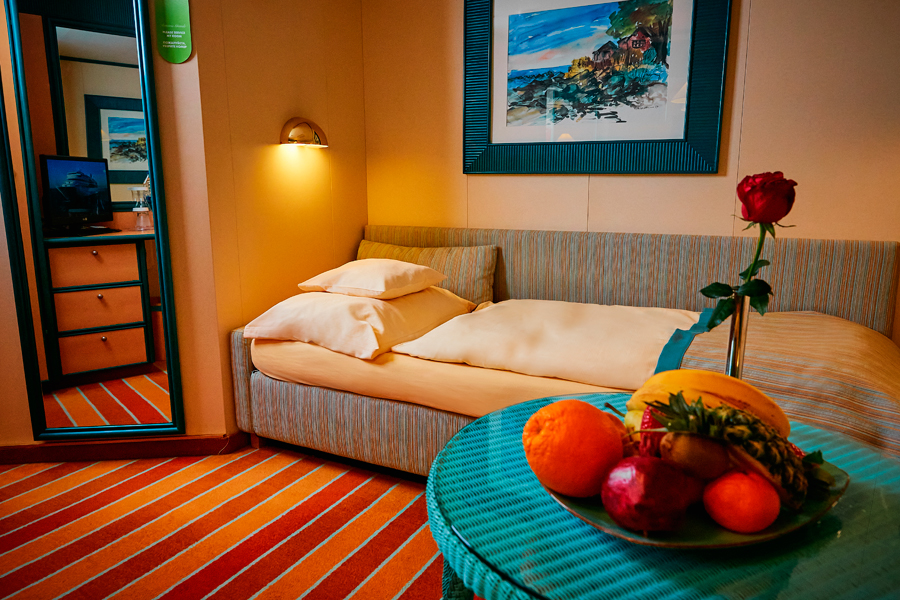 В каюте: односпальная кровать, диван, ванная комната (раковина, душ, туалет), кондиционер, гардероб, телевизор, телефон, фен, сейф, халаты, увлажнитель воздуха.