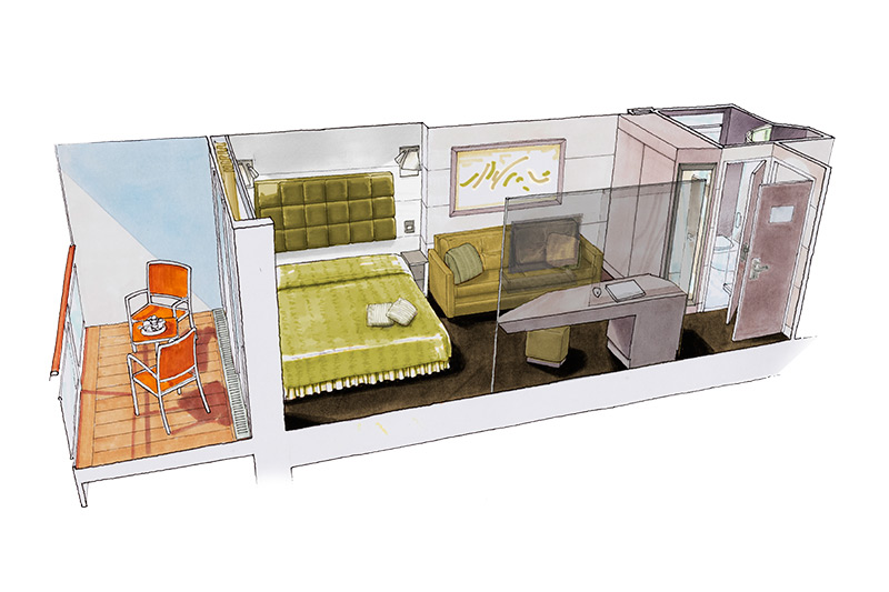 В каюте: односпальная кровать, ванная комната (раковина, душ, туалет), телефон, фен, мини-бар, сейф, кондиционер, интерактивное TV, беспроводной интернет (оплачивается дополнительно), персональный балкон с мебелью для отдыха.