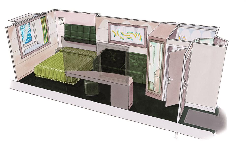 В каюте: две односпальные кровати (при необходимости трансформируются в двуспальную кровать), ванная комната (раковина, душ, туалет), телефон, фен, мини-бар, сейф, кондиционер, интерактивное TV, беспроводной интернет (оплачивается дополнительно), обзорное окно (не открывается).