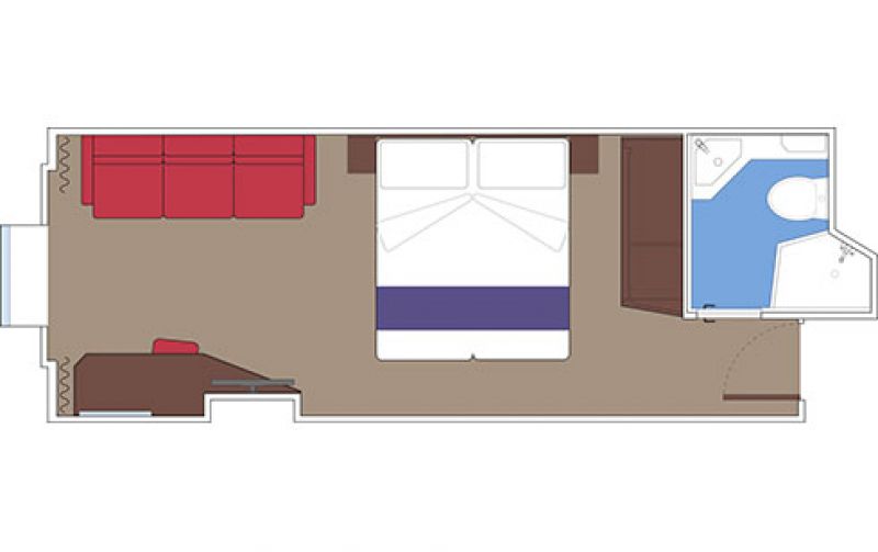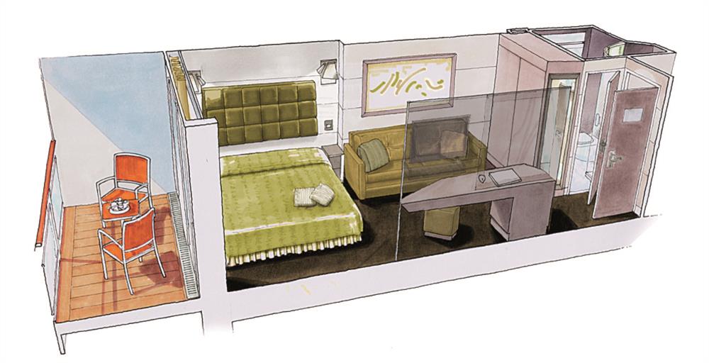В каюте: две односпальные кровати (при необходимости трансформируются в двуспальную кровать), зона гостиной с диваном, ванная комната (раковина, душевая кабина, туалет), гардеробная, телефон, фен, мини-бар (включен в стоимость), сейф, кондиционер, кофемашина, интерактивное TV, беспроводной интернет (безлимитный интернет-пакет Browse cruise package на 2 устройства), персональный балкон с мебелью для отдыха.