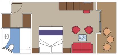 В каюте: две односпальные кровати (при необходимости трансформируются в двуспальную кровать), зона гостиной с диваном, ванная комната (раковина, душ, ванна, туалет), гардеробная, телефон, фен, мини-бар (включен в стоимость), сейф, кондиционер, кофемашина, интерактивное TV, беспроводной интернет (безлимитный интернет-пакет Browse cruise package на 2 устройства), балкон с обеденным столом и персональным джакузи.
