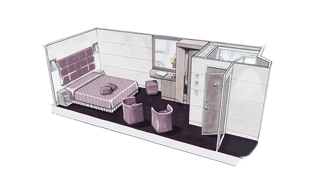 В каюте: две односпальные кровати (при необходимости трансформируются в двуспальную кровать), ванная комната (раковина, душ, туалет), телефон, фен, мини-бар (включен в стоимость), сейф, кондиционер, кофемашина, интерактивное TV, беспроводной интернет (безлимитный интернет-пакет Browse cruise package на 2 устройства), каюта без окна.
