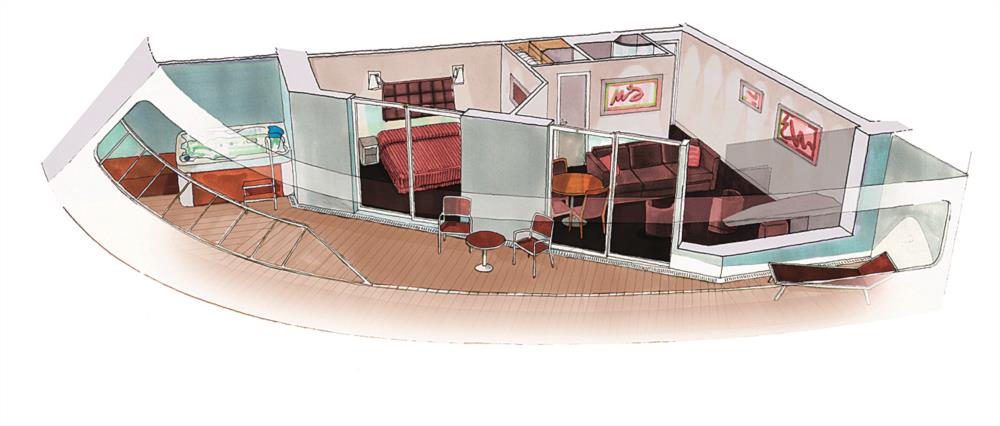 В каюте: две односпальные кровати (при необходимости трансформируются в двуспальную кровать), зона гостиной с диваном, две ванные комнаты (одна – с ванной, вторая – с душевой кабиной), две гардеробные, два телефона, фен, мини-бар, сейф, кондиционер, кофемашина, интерактивное TV, беспроводной интернет (безлимитный интернет-пакет Browse cruise package на 2 устройства), большой балкон с персональным джакузи.