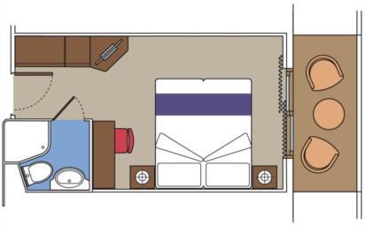 В каюте: две односпальные кровати (при необходимости трансформируются в двуспальную кровать), ванная комната (раковина, душ, туалет), телефон, фен, мини-бар, сейф, кондиционер, интерактивное TV, беспроводной интернет (оплачивается дополнительно), персональный балкон с мебелью для отдыха.