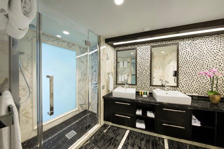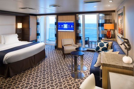 В каюте: двуспальная кровать, софа, две ванные комнаты (раковина, душ, туалет), телефон, интерактивное ТВ, радио, сейф, фен, мини-бар, кондиционер, обзорные панорамные окна, персональный балкон с мебелью для отдыха.