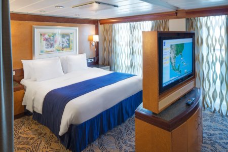 В каюте: двуспальная кровать, две односпальные кровати, две ванных комнаты (раковина, душ, туалет), диван, кресло, интерактивное TV, сейф, фен, мини-бар (за дополнительную плату), халаты, тапочки, набор туалетных принадлежностей, комплект полотенец, доставка багажа, стеклянная балконная дверь-окно, персональный балкон с мебелью для отдыха.