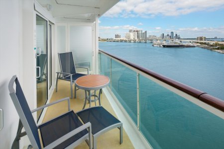В каюте: двуспальная кровать, ванная комната (раковина, душ, туалет), диван, кресло, интерактивное TV, сейф, фен, мини-бар (за дополнительную плату), халаты, тапочки, набор туалетных принадлежностей, комплект полотенец, доставка багажа, стеклянная балконная дверь-окно, персональный балкон с мебелью для отдыха.