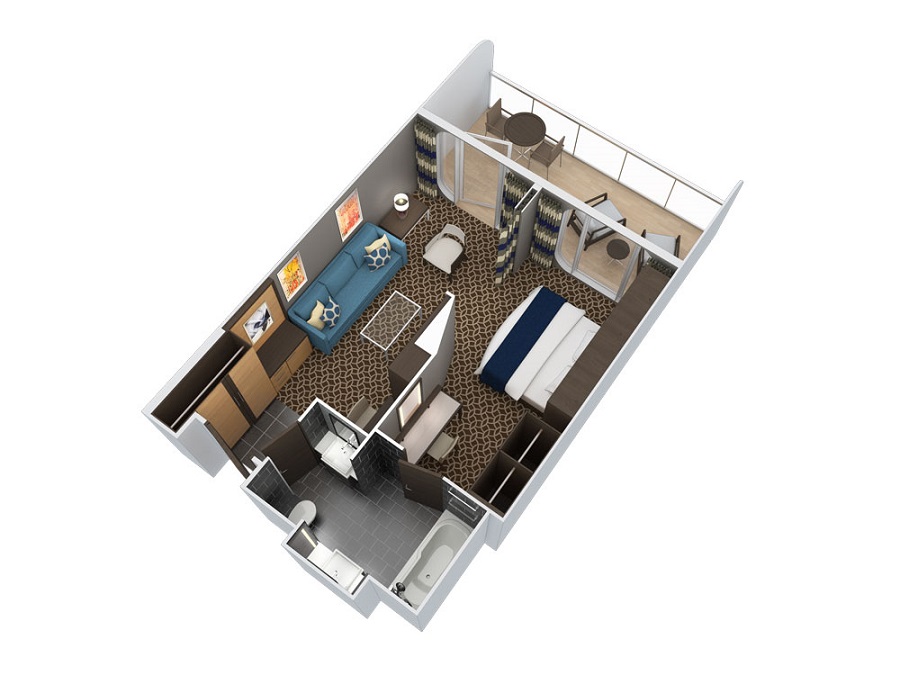 В каюте: одна двуспальная кровать (при необходимости трансформируется в две односпальные кровати), ванная комната (раковина, душ, туалет), зона гостиной с большим диваном и креслами, телевизор с системой интерактивного телевидения, сейф, фен, мини-бар, набор туалетных принадлежностей, полотенца, плюшевые халаты, тапочки, доставка багажа, обзорные панорамные окна, персональный балкон с мебелью для отдыха.