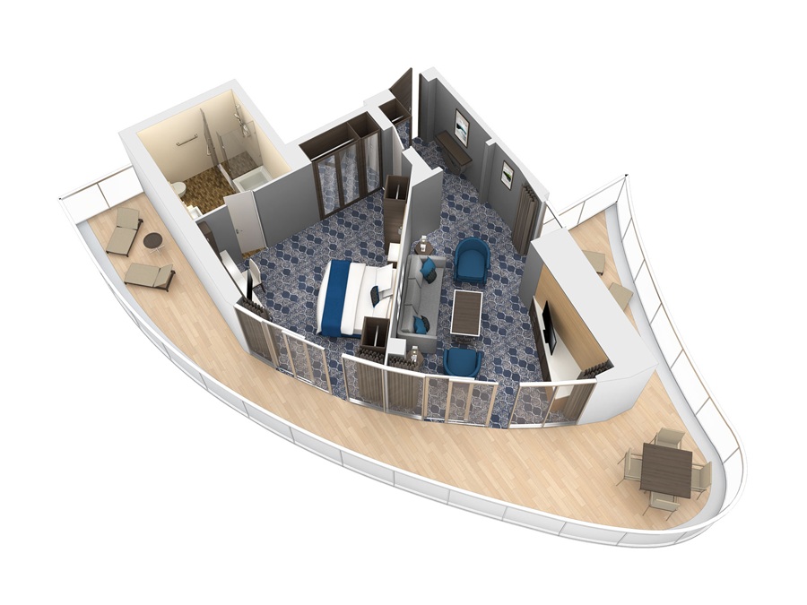 В каюте: двуспальная кровать, две ванные комнаты (раковина, душ, туалет), диван, телевизор, сейф, фен, халаты, тапочки, мини-бар (за дополнительную плату), набор люксовых туалетных принадлежностей, комплект полотенец, доставка багажа, стеклянная балконная дверь-окно, персональный балкон с мебелью для отдыха.