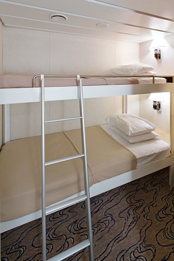 В каюте: две односпальные кровати и два дополнительных спальных места верхнего расположения, ванная комната (раковина, душ, туалет), кофейный столик, кресло, зеркало, телефон, телевизор, сейф, фен, мини-бар, кондиционер, банные халаты, набор туалетных принадлежнорстей, выделенная линия для подключения к сети интернет (оплачивается дополнительно), без окна.
