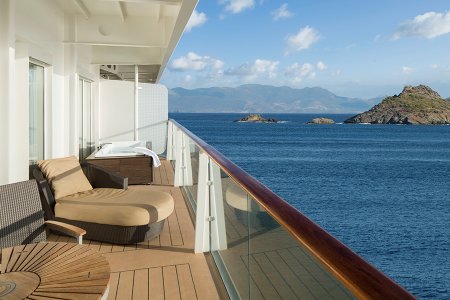 В каюте: двуспальная кровать, ванная комната (раковина, душ, туалет), диван, интерактивное ТВ, сейф, фен, мини-бар (за дополнительную плату), халаты, тапочки, набор туалетных принадлежностей, комплект полотенец, доставка багажа, стеклянная балконная дверь-окно, персональный балкон с мебелью для отдыха.