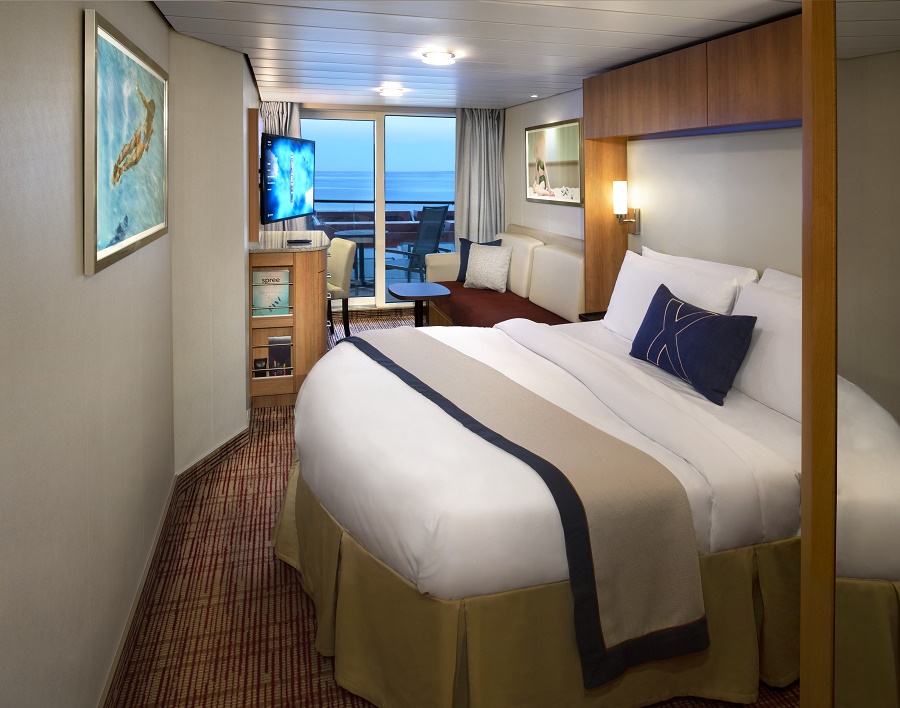 В каюте: двуспальная кровать, ванная комната (раковина, душ, туалет), интерактивное ТВ, сейф, фен, мини-бар (за дополнительную плату), халаты, тапочки, набор туалетных принадлежностей, комплект полотенец, доставка багажа, стеклянная балконная дверь-окно, персональный балкон с мебелью для отдыха.