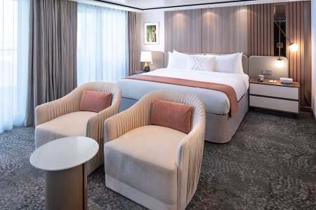 В каюте: двуспальная кровать, ванная комната (раковина, душ, туалет), диван, интерактивное ТВ, сейф, фен, мини-бар (за дополнительную плату), халаты, тапочки, набор туалетных принадлежностей, комплект полотенец, доставка багажа, обзорное окно.