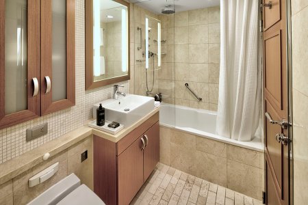 В каюте: двуспальная кровать, ванная комната (раковина, душ, туалет), диван, интерактивное ТВ, сейф, фен, мини-бар (за дополнительную плату), халаты, тапочки, набор туалетных принадлежностей, комплект полотенец, доставка багажа, без окна.