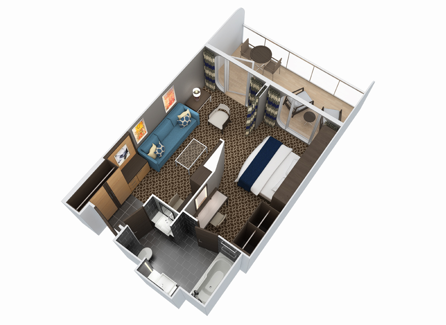 В каюте: одна двуспальная кровать (при необходимости трансформируется в две односпальные кровати), ванная комната (раковина, душ, туалет), туалетные принадлежности, фен, диван, кресло, кофейный столик, интерактивное TV, телефон, сейф, кондиционер, мини-бар (оплачивается дополнительно), выделенная линия для подключения к сети интернет (оплачивается дополнительно), стеклянная балконная дверь-окно, персональный балкон с мебелью для отдыха.